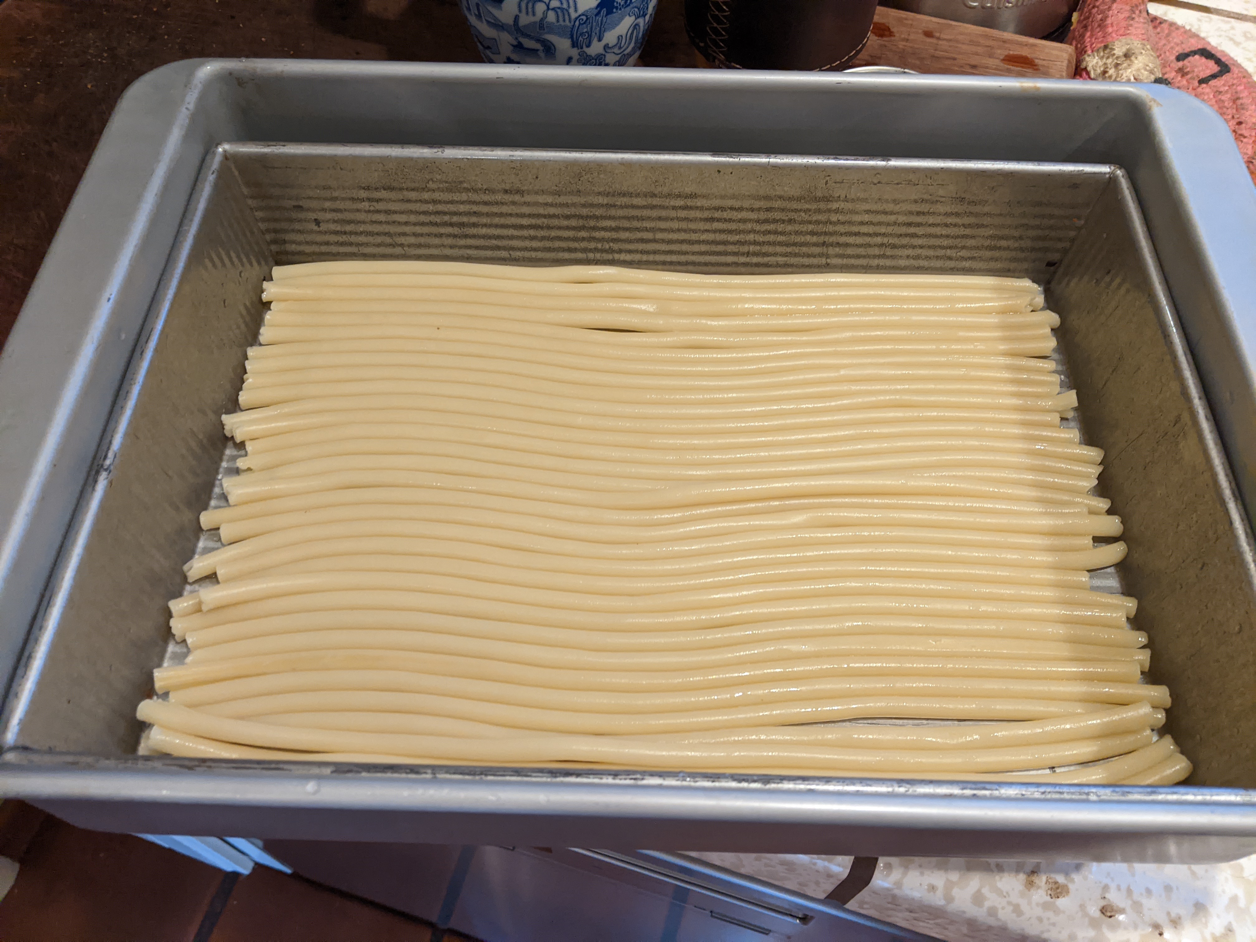 Everything ready to go. I love the color of the meat sauce, such a rich red-brown color.